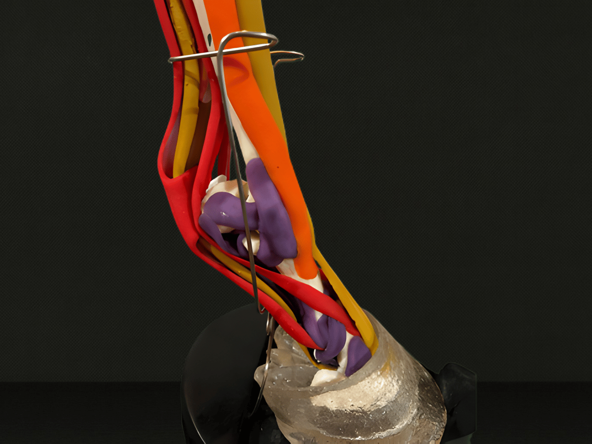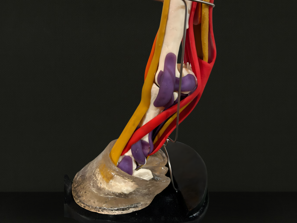 Durable resin bones and elastomer tendons that stretch and compress, simulating natural tissue behavior